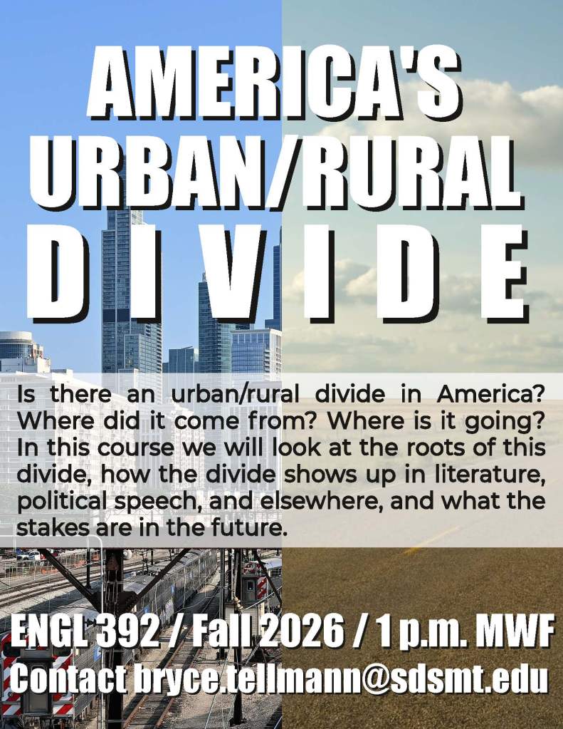 • Topics: Urban/Rural Divide in American (ENGL 392) – MWF at 1 pm