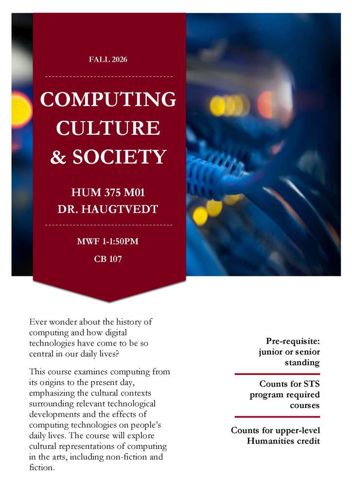 • Computing, Culture, and Society (HUM 375) – MWF at 2 pm
